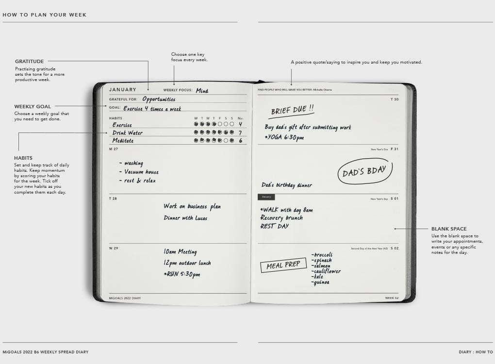 MiGoals b6 goal diary in the weekly spread format, explained and annotated, on a peach backgroundannotated